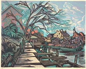 The image used for the exhibit’s poster is "Taking the Path Least Travelled", a reduction woodcut that depicts Portsmouth Harbor as seen from the riverbank on Bow St, Portsmouth, NH, in the 1990s. Today, the view from the riverbank is obscured by recent development.