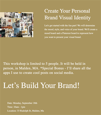 Join me for a free workshop on Monday, September 18th from 10am to 1pm in Malden to learn the critical foundations of building a powerful Personal Brand.
